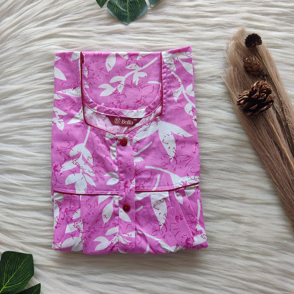 White Leaf Printed Pink Premium Cotton Button Zip Nighty | Free Size | Chest Width 44″| Length 55″-56″