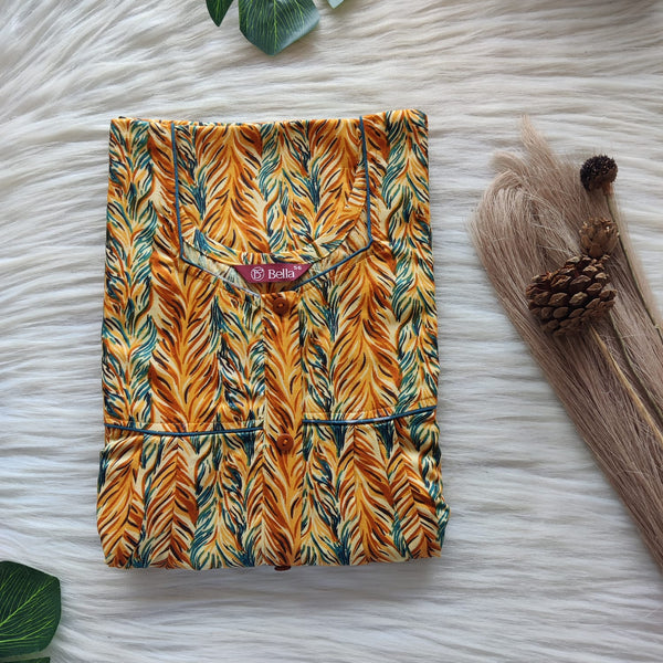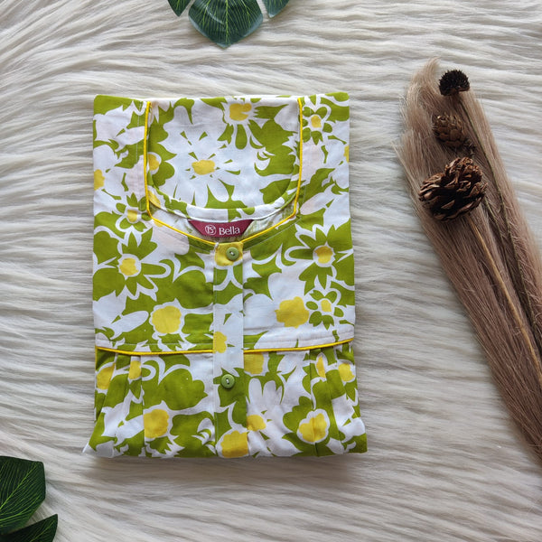 Yellow And Green Printed Premium Cotton Button Zip Nighty | Free Size | Chest Width 44″| Length 55″-56″