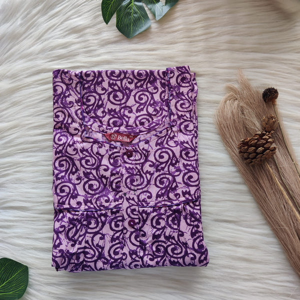 Purple Printed Premium Cotton Button Zip Nighty | Free Size | Chest Width 44″| Length 55″-56″