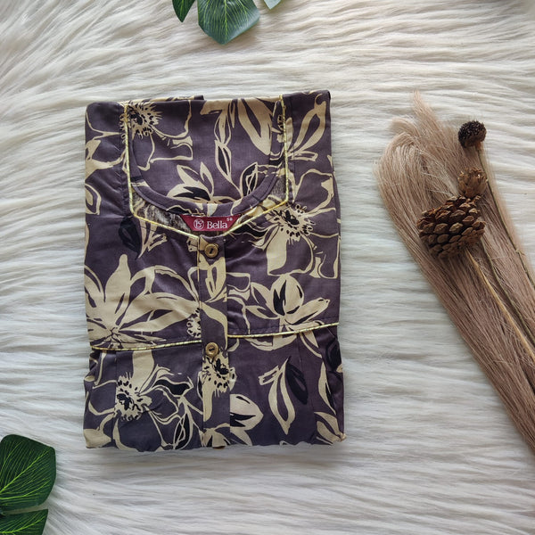 Grey And Yellow Floral Printed Premium Cotton Button Zip Nighty | Free Size | Chest Width 44″| Length 55″-56″