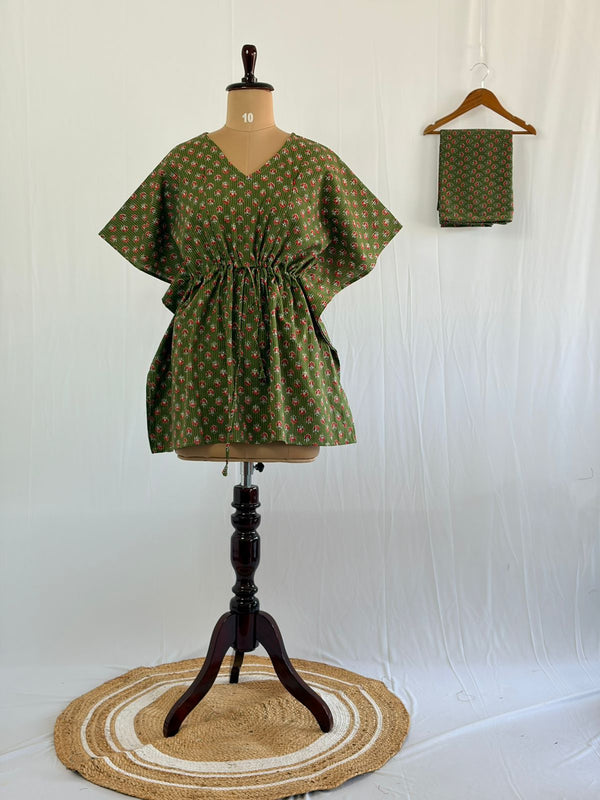 Green Floral Printed Kantha Cotton Kaftan Loungewear Pyjama Set | Free Size |