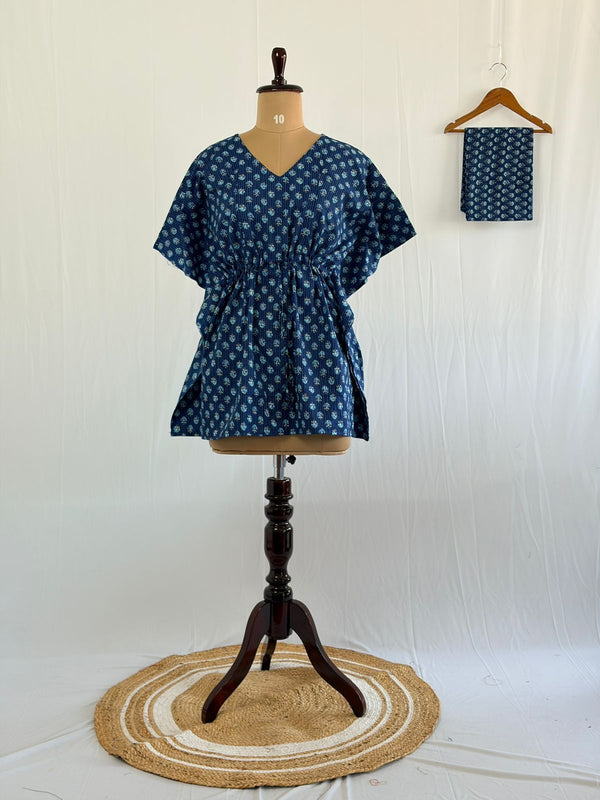Blue Kalamkari Printed Kantha Cotton Feeding Kaftan Loungewear Pyjama Set | Free Size