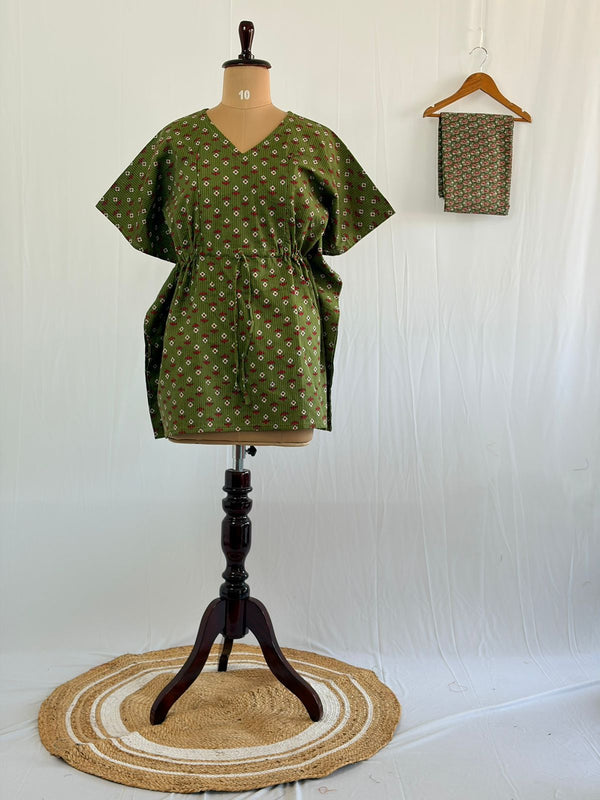 Green Kalamkari Printed Kantha Cotton Feeding Kaftan Loungewear Pyjama Set | Free Size