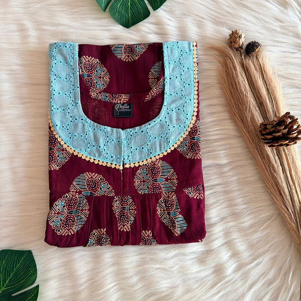 Maroon Ajrakh Printed Gujari Cotton Hakoba Lace Nighty | Free Size | Chest Width 44″| Length 54″-56″