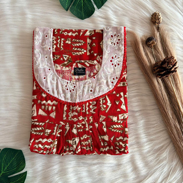 Red And Cream Ajrakh Printed Gujari Cotton Hakoba Lace Nighty | Free Size | Chest Width 44″| Length 54″-56″