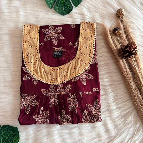 Maroon And Cream Printed Gujari Cotton Hakoba Lace Nighty | Free Size | Chest Width 44″| Length 54″-56″