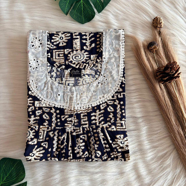 Navy-Blue Printed Gujari Cotton Hakoba Lace Nighty | Free Size | Chest Width 44″| Length 54″-56″