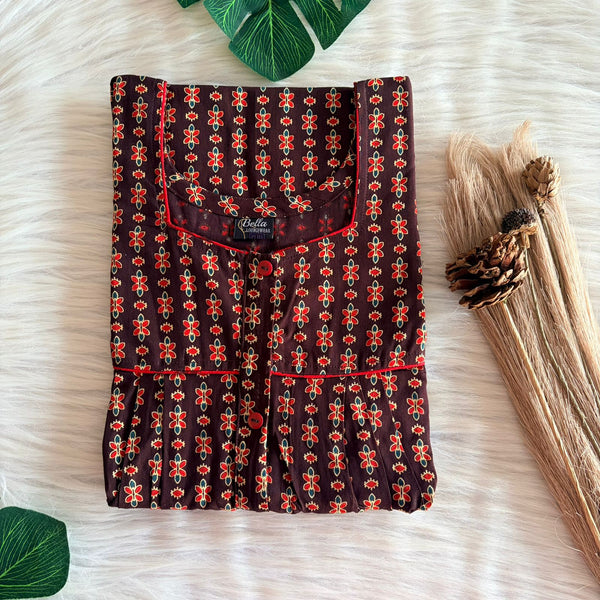 Red Printed Brown Gujari Cotton Button Zip Nighty | Free Size | Chest Width 44″| Length 55″-56″