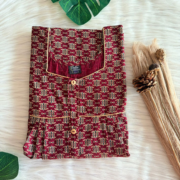 Maroon Printed Gujari Cotton Button Zip Nighty | Free Size | Chest Width 44″| Length 55″-56″