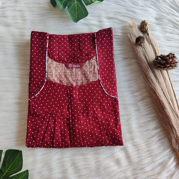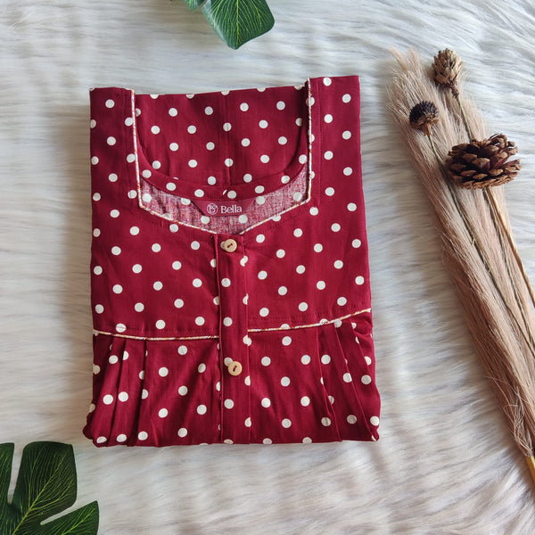 Maroon Dot Gujari Cotton Pleated Zip Nighty | Chest Width 44″ | Length 54″-55″