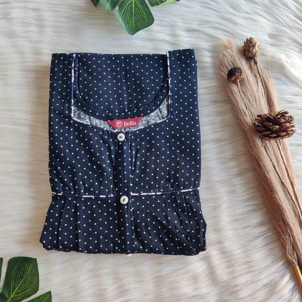 Navy-Blue Dot Printed Gujari Cotton Button Zip Nighty | Free Size | Chest Width 44″| Length 55″-56″