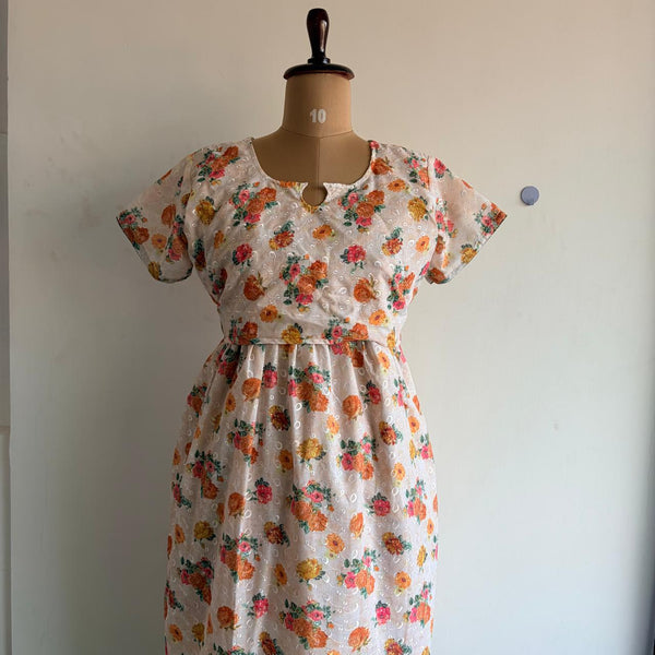 Cream Floral Printed Hakoba Ruffle Sleeve Short Maternity Gown | Free Size | Chest Width 44″| Length 44″