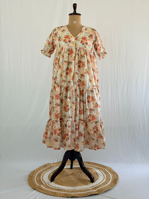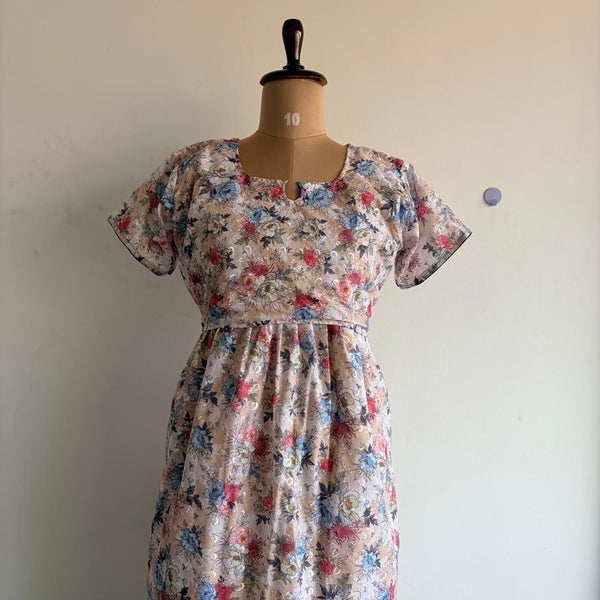 Cream And Brown Floral Hakoba Flared Feeding Gown With Single Centre Invisible Zip | Free Size | 46" length
