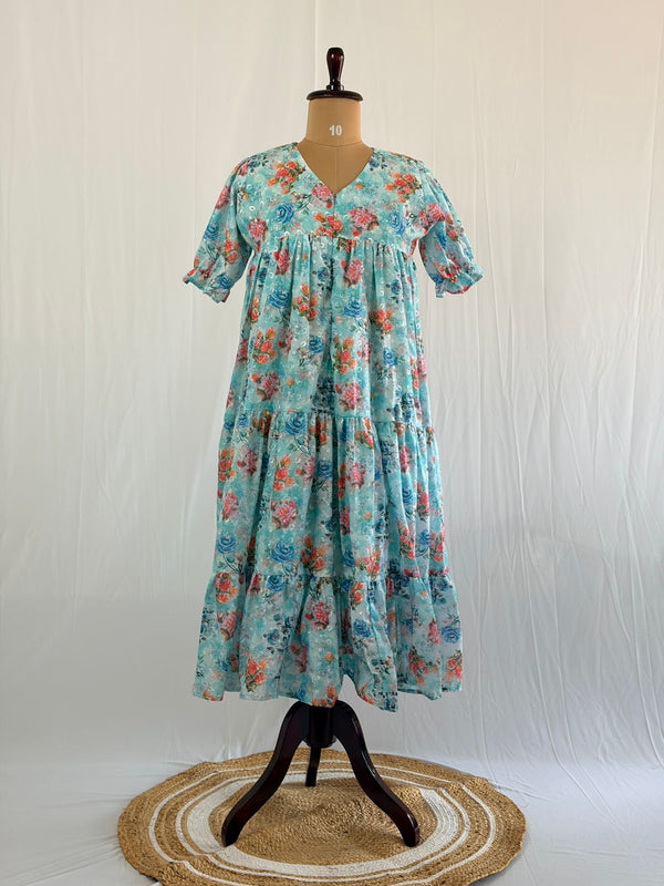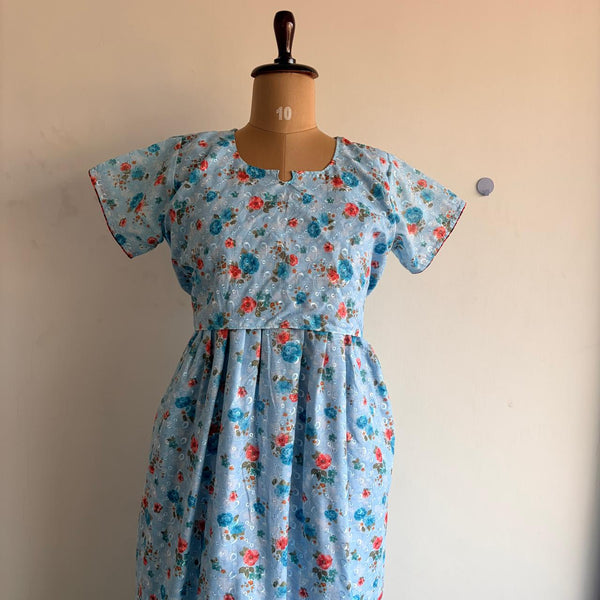 Blue Floral Hakoba Flared Feeding Gown With Single Centre Invisible Zip | Free Size | 46" length