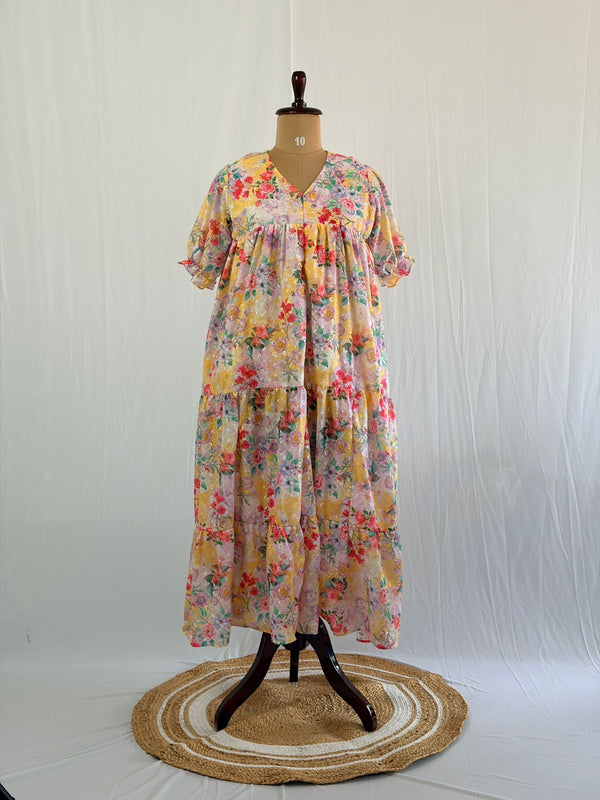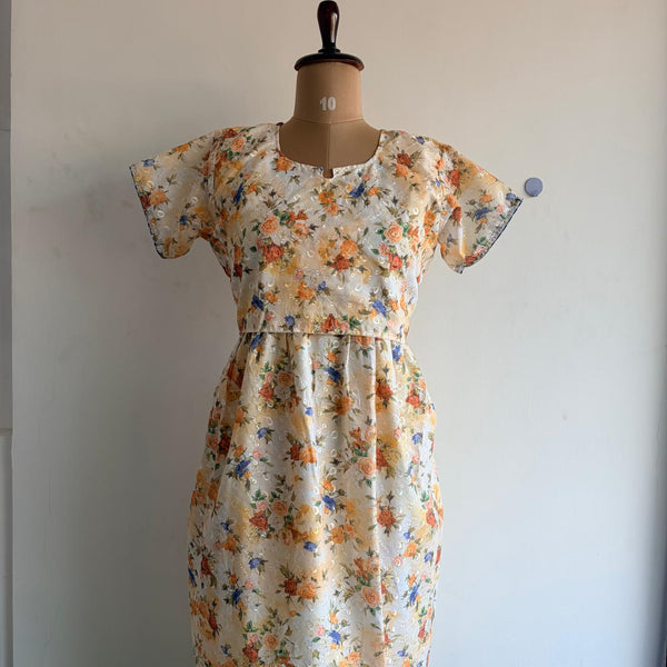 Yellow Floral Hakoba Flared Feeding Gown With Single Centre Invisible Zip | Free Size | 46" length
