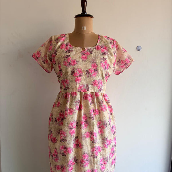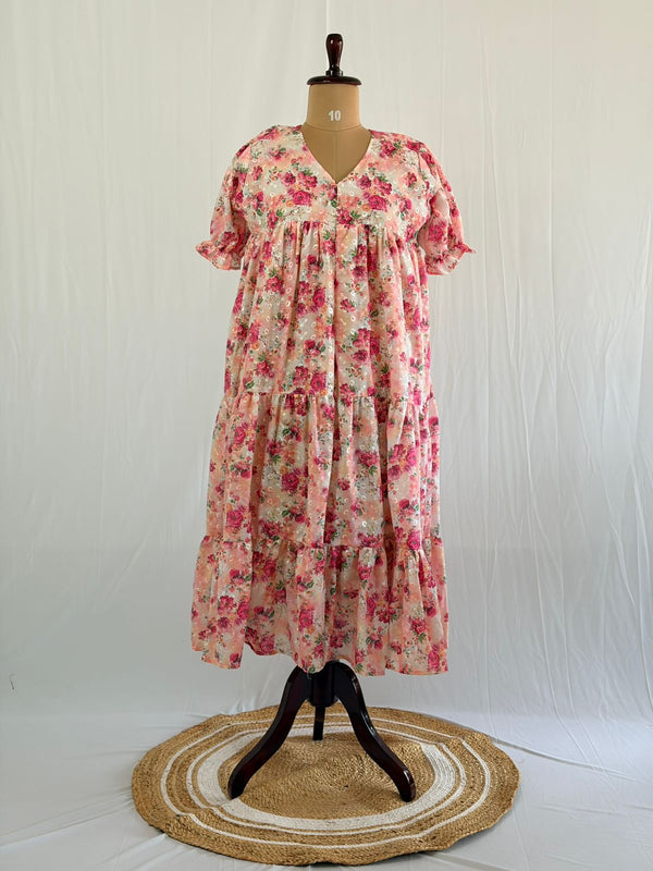 Pink Floral Hakoba Flared Feeding Gown With Single Centre Invisible Zip | Free Size | 46" length