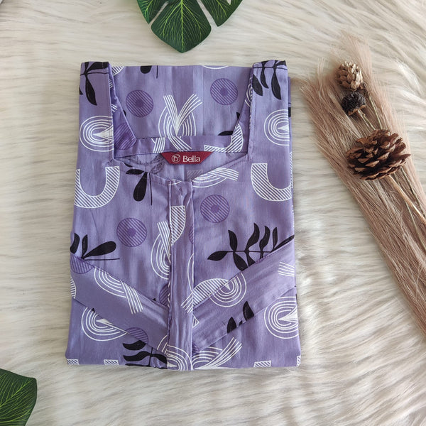 Lavender Printed Premium Cotton Horizontal Zip Feeding Nighty | Free Size | Chest Width 44″| Length 54″-56″|