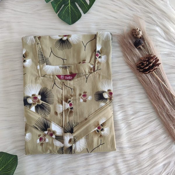 Brown Printed Premium Cotton Horizontal Zip Feeding Nighty | Free Size | Chest Width 44″| Length 54″-56″|