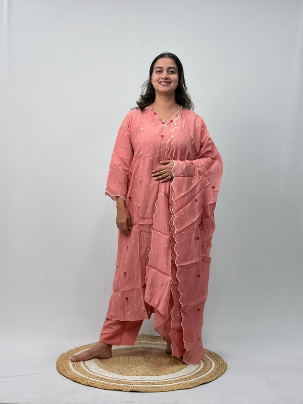 Pastel Peach Floral Embroidered 3 Piece Set