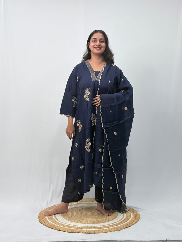 Navy-Blue Floral Embroidered 3 Piece Set