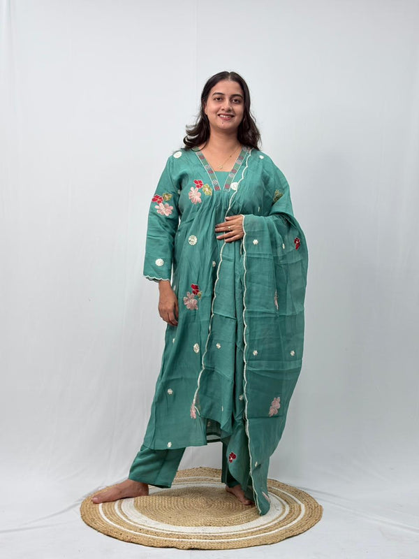 Green Floral Embroidered 3 Piece Set