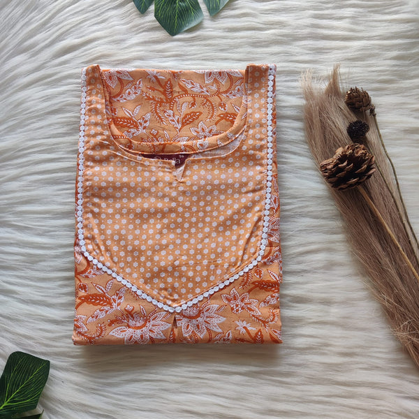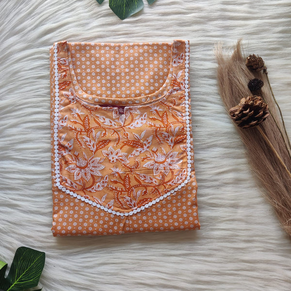 Brick Orange Printed Premium Cotton Hakoba Lace Nighty | Free Size | Chest Width 44″| Length 54″-56″