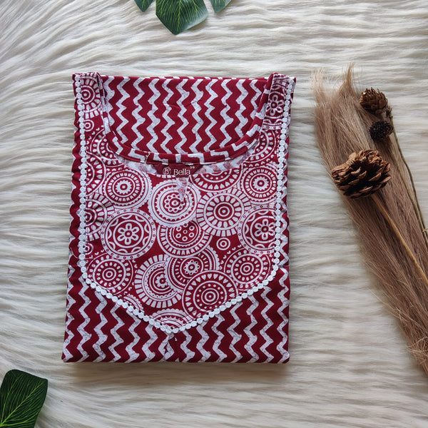 Maroon Floral Printed Premium Cotton Hakoba Lace Nighty | Free Size | Chest Width 44″| Length 54″-56″
