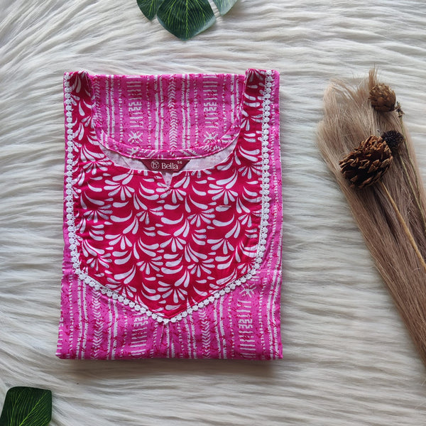 White Floral Printed Pink Premium Cotton Hakoba Lace Nighty | Free Size | Chest Width 44″| Length 54″-56″