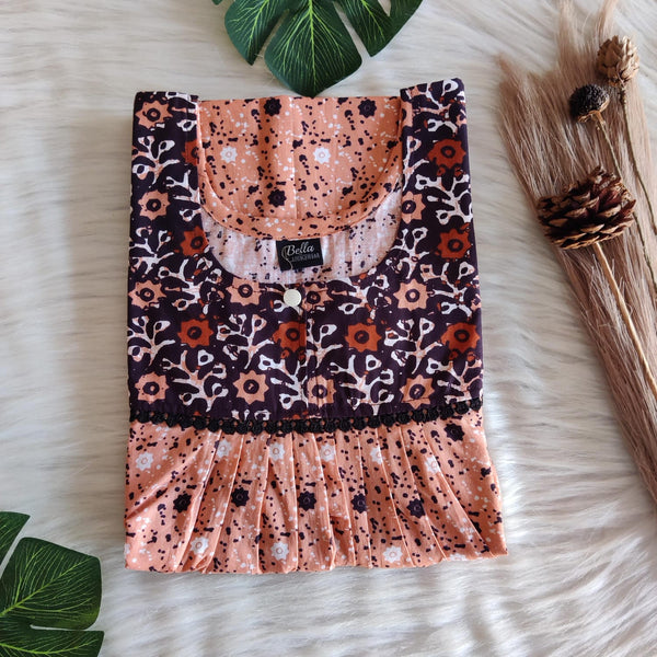 Brown And Pastel Orange Printed Premium Cotton Lace Nighty | Free Size | Chest Width 44″| Length 54″-56″