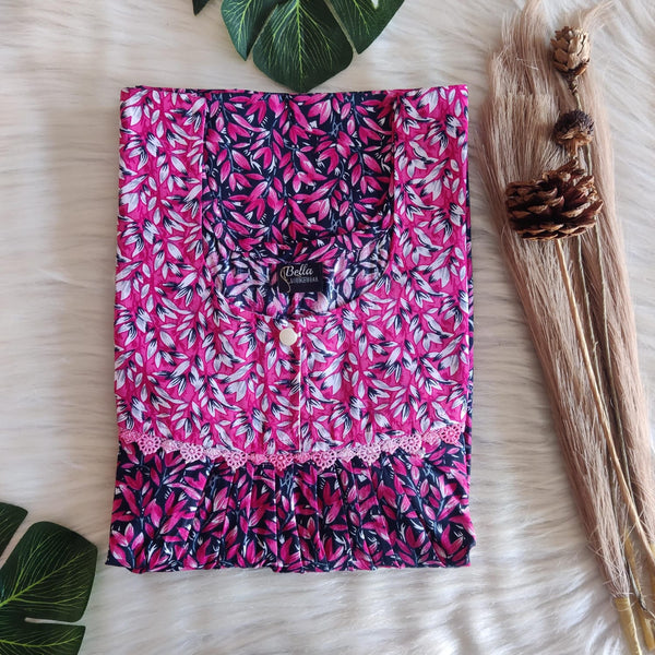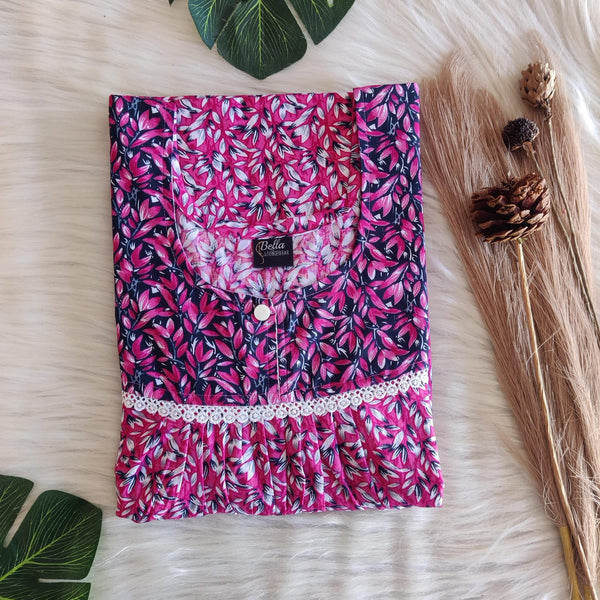Pink And Navy-Blue Leaf Printed Premium Cotton Lace Nighty | Free Size | Chest Width 44″| Length 54″-56″
