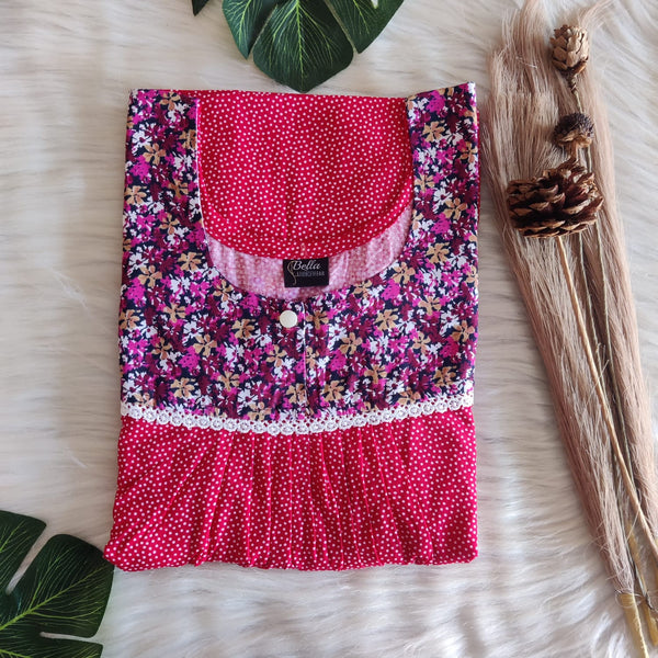 Pink And Red Dot Printed Premium Cotton Lace Nighty | Free Size | Chest Width 44″| Length 54″-56″