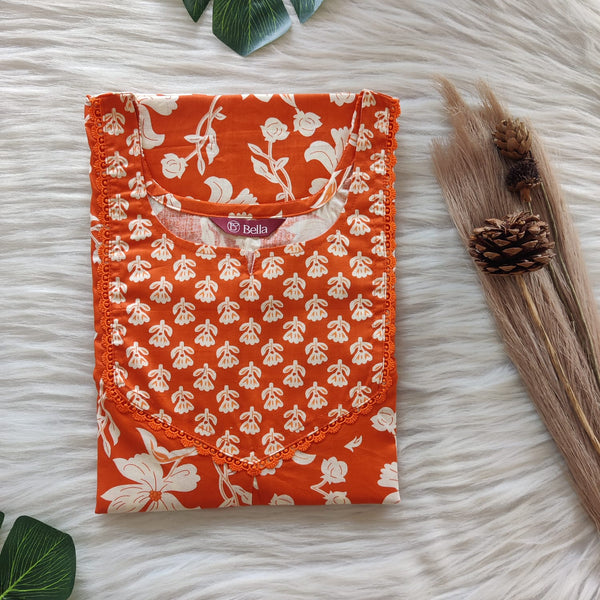 Rust Orange Printed Coffee Brown Discharge Cotton Hakoba Lace Nighty | Free Size | Chest Width 44″| Length 54″-56″