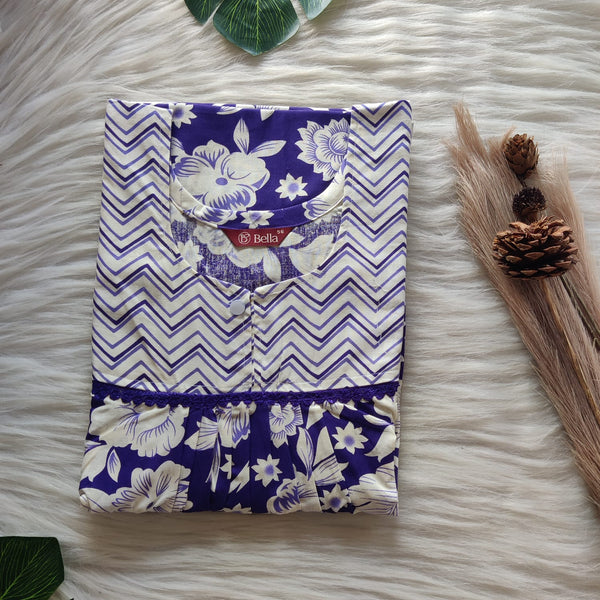 Violet And White Floral Printed Premium Cotton Lace Nighty | Free Size | Chest Width 44″| Length 54″-56″