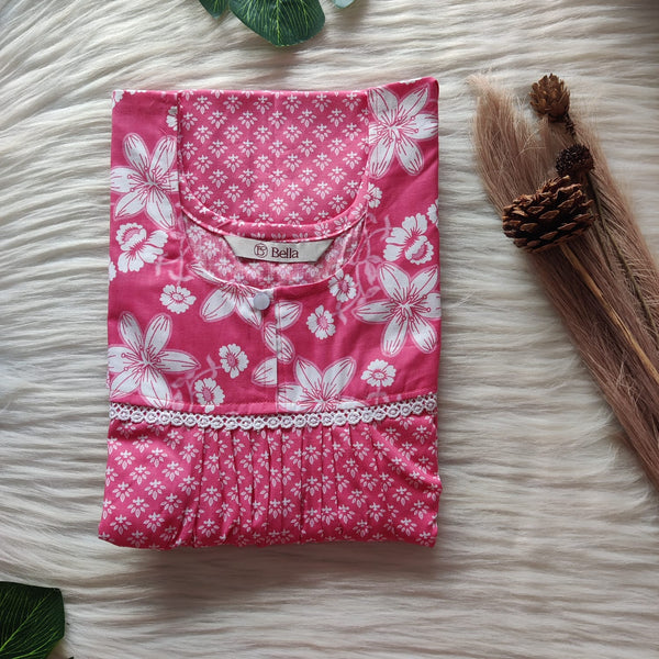 Pink Printed Premium Cotton Hakoba Lace Nighty | Free Size | Chest Width 44″| Length 54″-56″