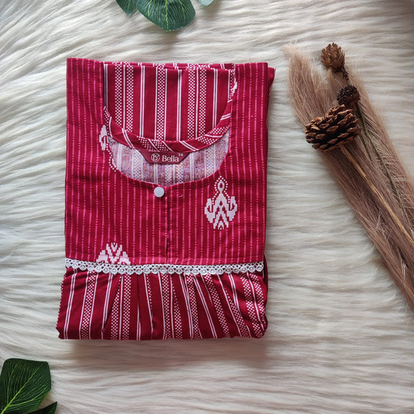 Red And White Stripes Printed Premium Cotton Lace Nighty | Free Size | Chest Width 44″| Length 54″-56″