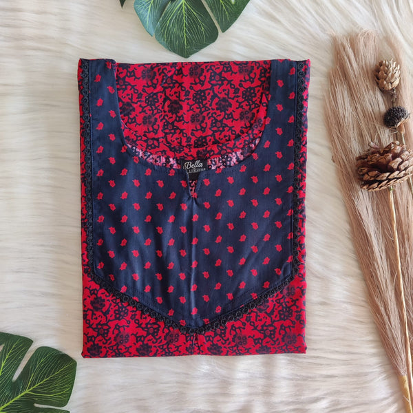 Red And Navy- Blue Printed Premium Cotton Mix N Match Lace Pocket Nighty | Free Size | Chest Width 44″| Length 56″