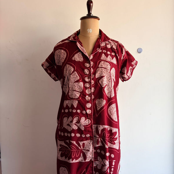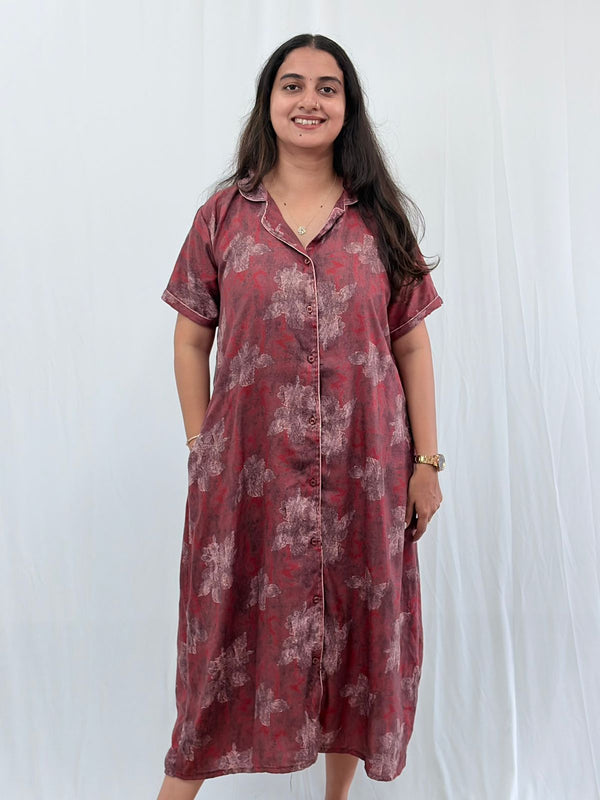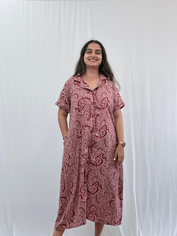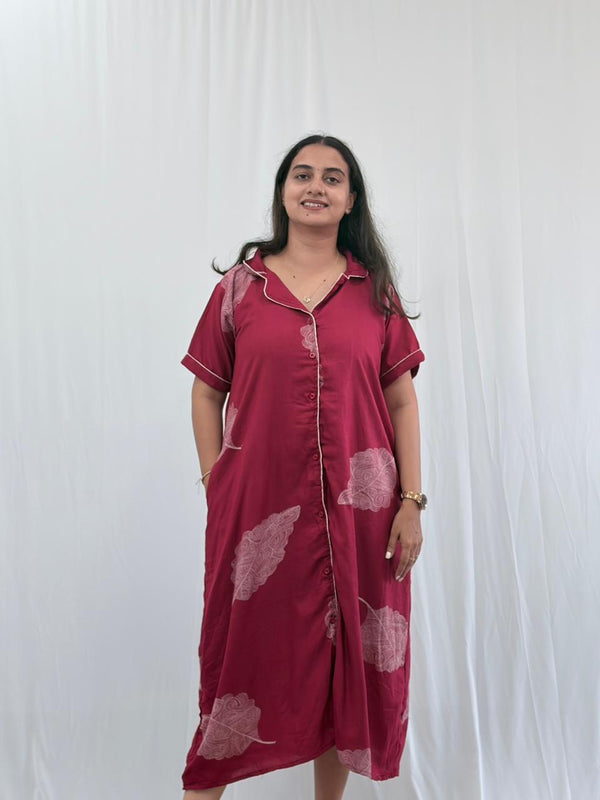 Maroon Printed Alpine Full Open Long Polo Shirt Dress | Side Pocket | Free Size | Chest Width 44″| Length 44″
