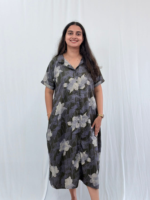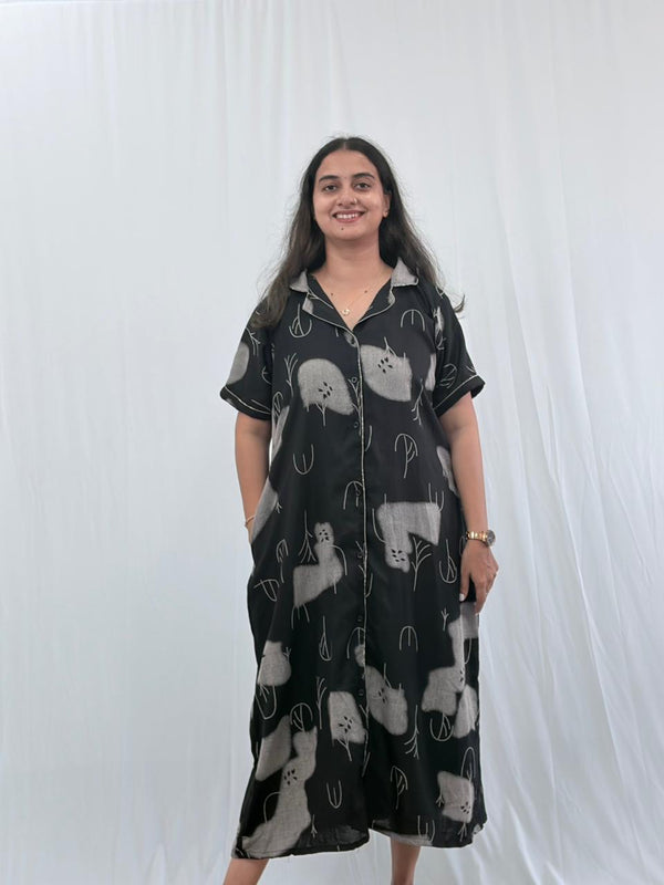 Black Printed Alpine Full Open Long Polo Shirt Dress | Side Pocket | Free Size | Chest Width 44″| Length 44″