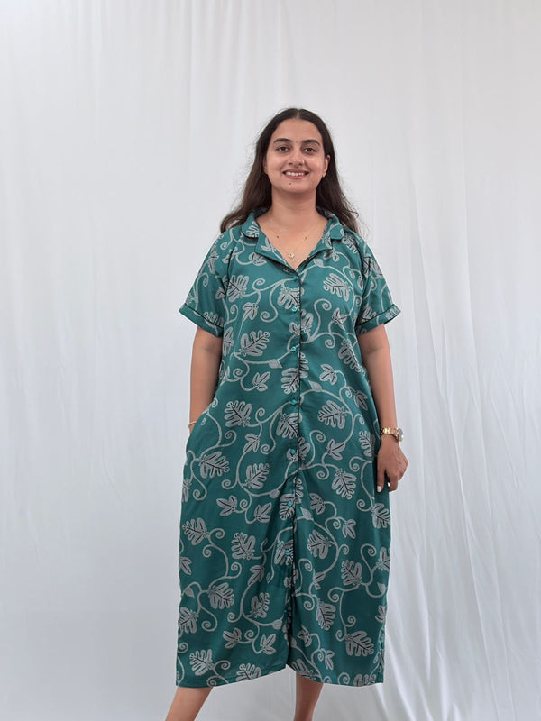 Green Check Printed Peter Pan Long Polo Shirt Dress With Full Openable Buttons | Free Size | 43" length