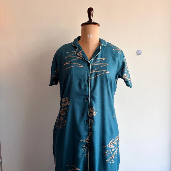 Blue Printed Alpine Full Open Long Polo Shirt Dress | Side Pocket | Free Size | Chest Width 44″| Length 44″