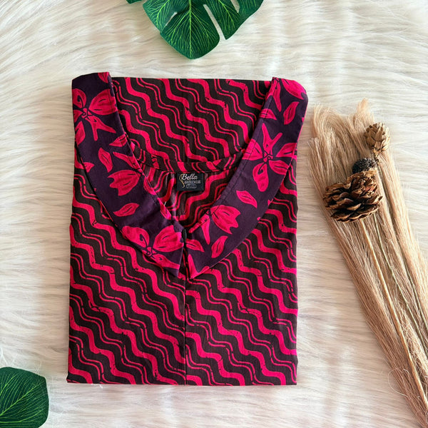 Black And Pink Floral Printed Premium Cotton Peter Pan Collar Long Zip Feeding Nighty | Free Size | Chest Width 44″| Length 56″