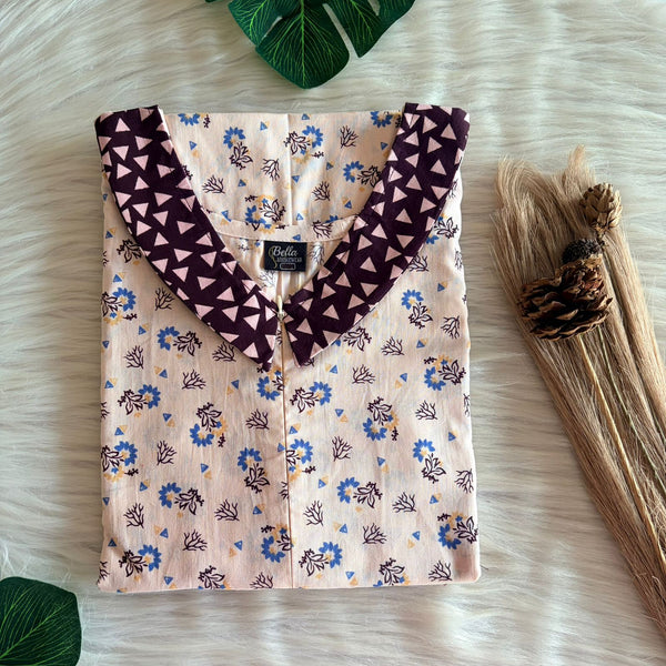 Pale And Dark Purple Printed Premium Cotton Peter Pan Collar Long Zip Feeding Nighty | Free Size | Chest Width 44″| Length 56″