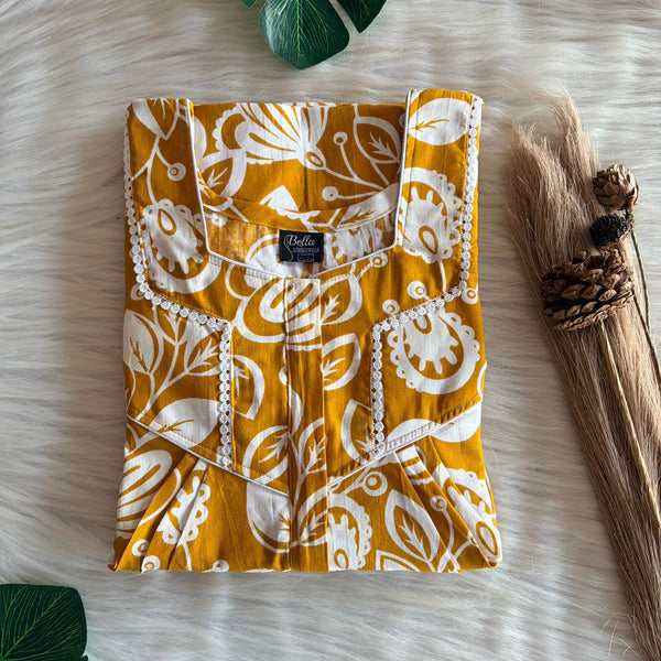 Mustard Yellow Printed Premium Cotton Long Zip Lace Feeding Nighty | Free Size | Chest Width 44″| Length 56″