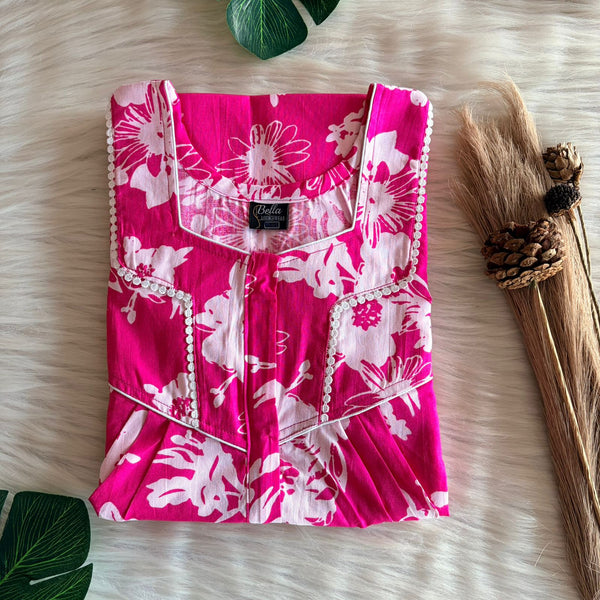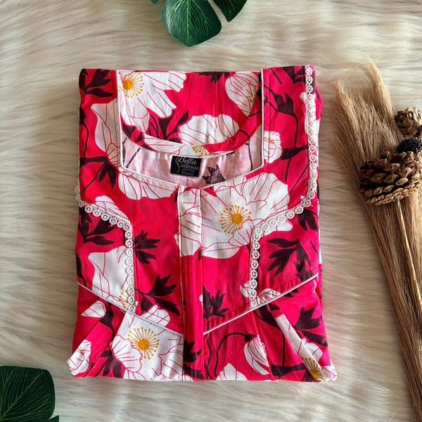 Pink And White Floral Printed Premium Cotton Long Zip Lace Feeding Nighty | Free Size | Chest Width 44″| Length 56″
