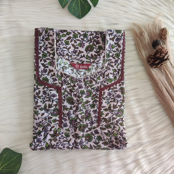 Green Floral Printed Mauve Premium Cotton Long Zip Lace Feeding Nighty | Free Size | Chest Width 44″| Length 56″