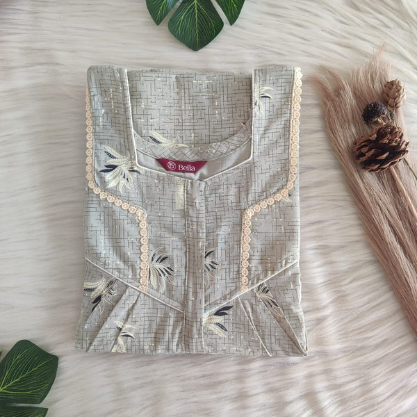 Grey And Yellow Floral Printed Premium Cotton Peter Pan Collar Long Zip Feeding Nighty | Free Size | Chest Width 44″| Length 56″
