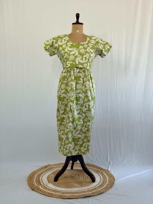Green Floral Printed Kantha Cotton Buttonless Zipless Short Maternity Nighty | Free Size |