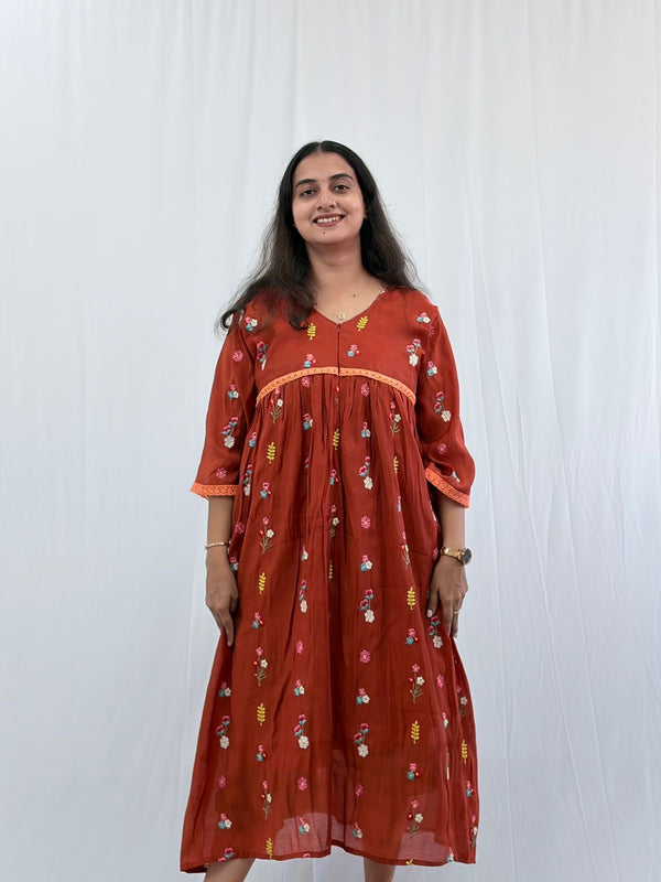 Peach Floral Embroidered Mul Chanderi Flared Feeding Gown With Single Centre Invisible Zip | Free Size | 44" length