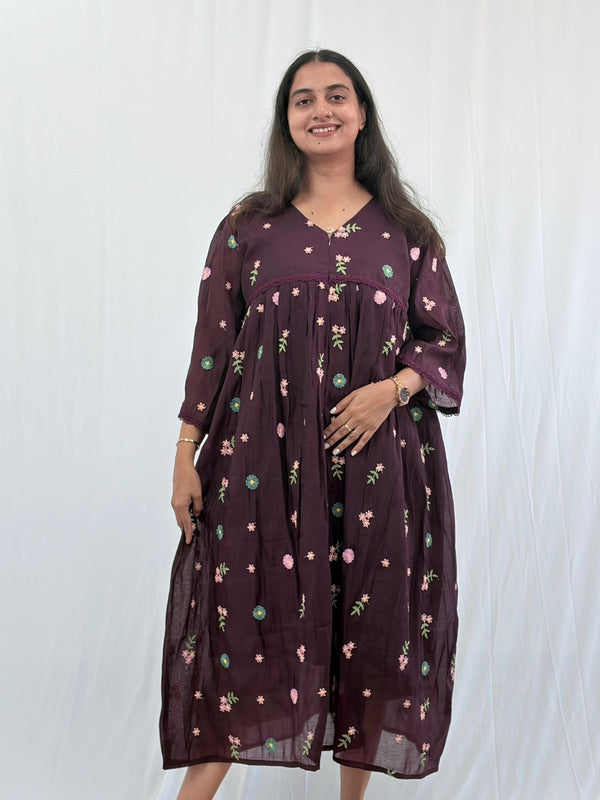 Purple Floral Embroidered Mul Chanderi Flared Feeding Gown With Single Centre Invisible Zip | Free Size | 44" length
