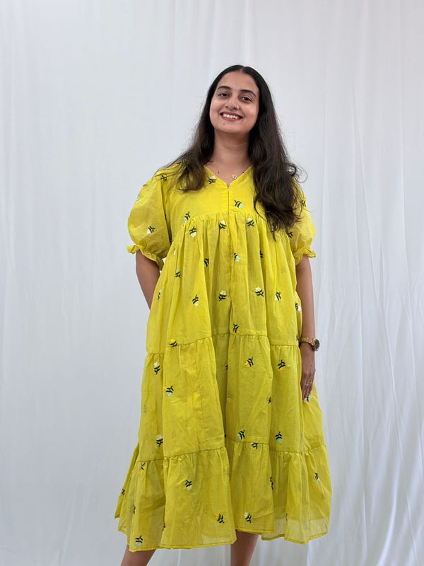 Yellow Floral Embroidered Mul Chanderi Flared Feeding Gown With Single Centre Invisible Zip | Free Size | 44" length